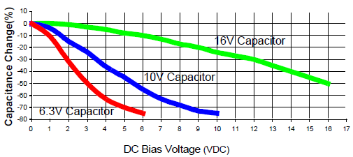 Z5U and Y5V also exhibit a severe temperature effect loosing more than 50% of nominal capacitance and the top and bottom ends of the temperature range.