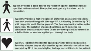 This product classification deals with the definition of applied parts—those parts or circuits that deliberately come in physical contact with the patient. The classification applies to each applied part. They are classified either as type B, BF or CF, depending on the degree of protection they offer against electric shock